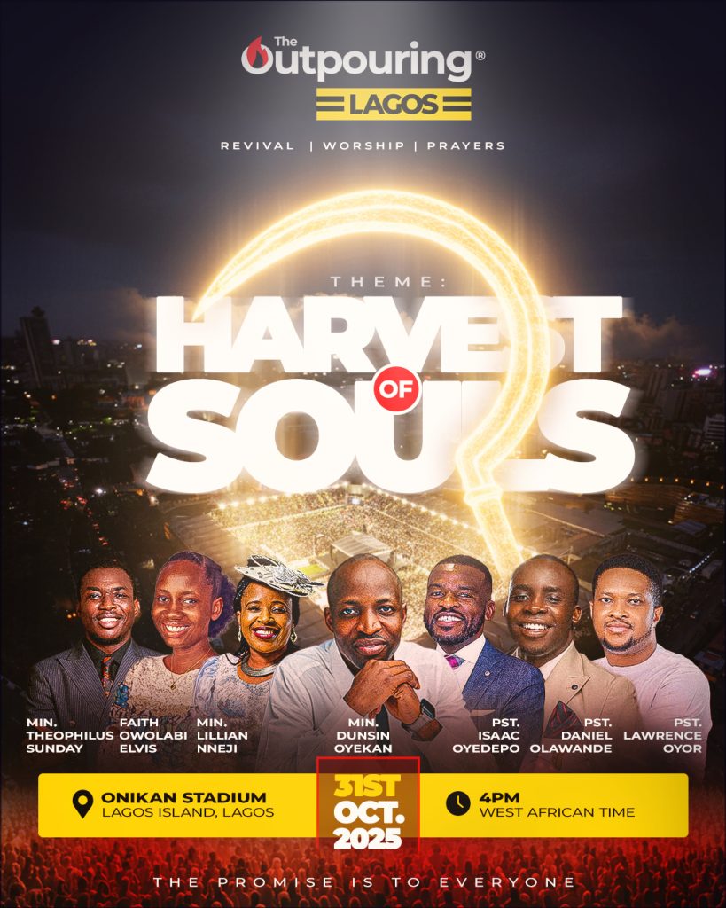 The Outpouring, a global revival movement that began in 2021, returns to Lagos this October with the theme “Harvest of Souls.” The citywide worship and prayer gathering will hold on Friday, October 31st, 2025, at Onikan Stadium, Lagos, starting at 4:00 PM. Entry is free and it requires no registration.